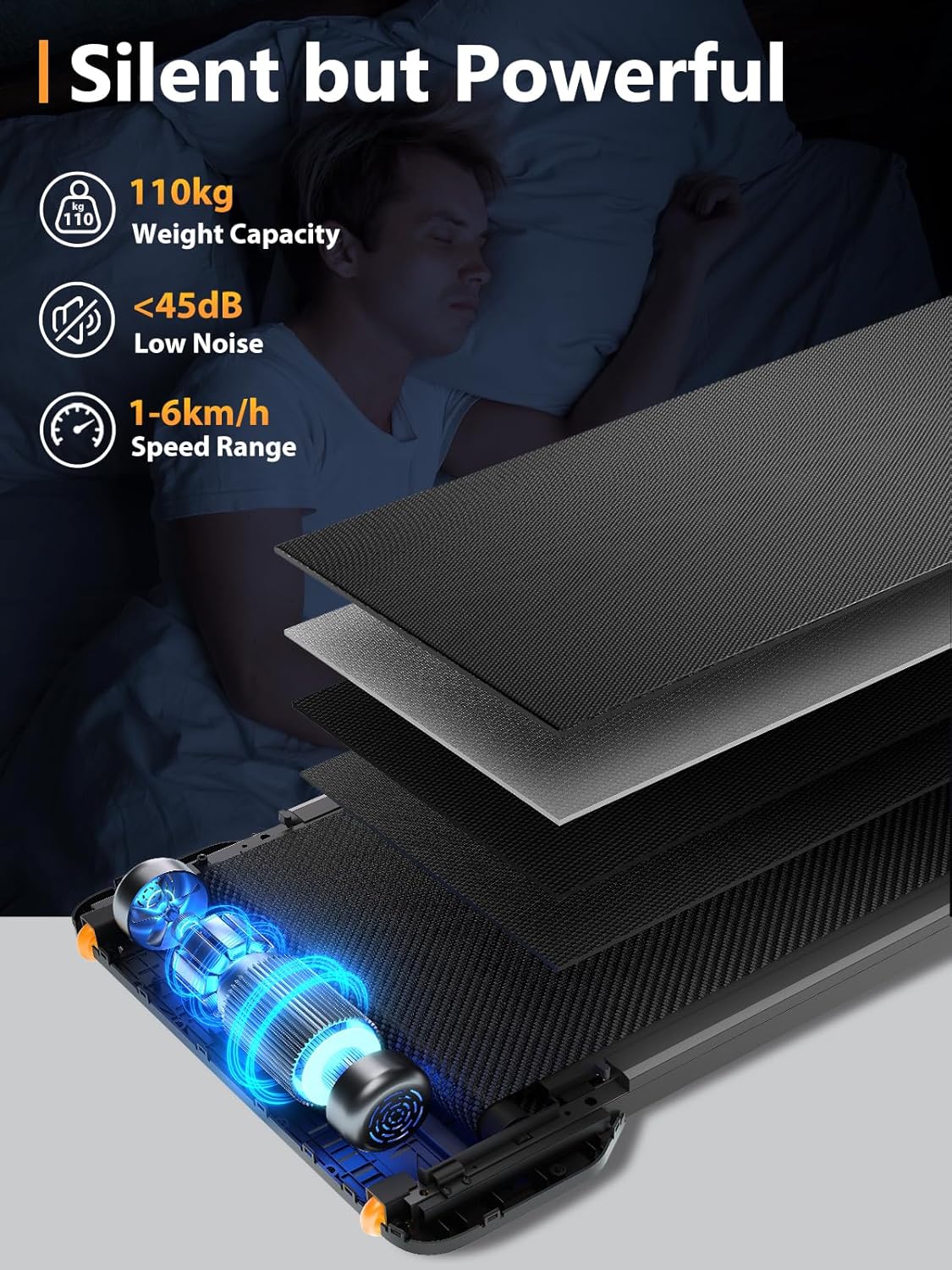 - Immersive Running - Enjoy uninterrupted workouts with the folding treadmill Z1's ultra-quiet operation. The walking treadmill Z1 is equipped with a super-quiet brushless motor, tested to operate below 45 decibels, it ensures you can focus on your fitness goals without disturbing others, whether it's an early morning run or a late-night workout session.